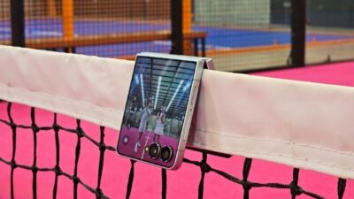 Fleksibilitas Galaxy Z Flip7 memungkinkan pengguna menempatkannya di berbagai posisi unik, seperti di atas net padel, untuk menangkap momen olahraga dari sudut pandang yang estetik
