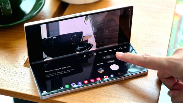 Dengan Flex mode, pengguna Galaxy Z Fold6 dapat menikmati berbagai kemudahan, terutama ketika perangkat dilipat pada sudut tertentu, menyerupai laptop mini.