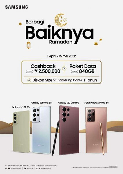 Menariknya, kamu bisa mendapatkan Galaxy S22 Ultra 5G dengan penawaran menarik sepanjang periode 1 April s/d 15 Mei 2022. Kamu bisa menikmati cashback hingga Rp2.500.000, paket data hingga 840GB, serta diskon 50% untuk perlindungan Samsung Care+ selama 1 tahun.
