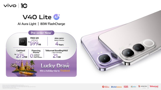 Vivo V40 Lite hadir dalam berbagai varian, mulai dari harga Rp3.299.000 untuk versi 4G dengan RAM 8GB dan ROM 128GB, hingga Rp5.299.000 untuk versi 5G dengan RAM 12GB dan ROM 512GB. Pre-order sudah dibuka sejak 25 September hingga 6 Oktober 2024, dengan berbagai penawaran menarik seperti exclusive gift box, program bundling Telkomsel, dan cicilan 0%.