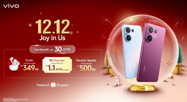 Mulai 1–12 Desember 2025, setiap pembelian vivo V60 Series berkesempatan mendapatkan gratis vivo TWS Buds senilai Rp349.000, bonus kuota XL hingga 36GB selama setahun, serta peluang memenangkan Trip Wisata Keluarga Rp25 juta hingga 31 Desember 2025 (khusus pembelian online, persediaan terbatas).