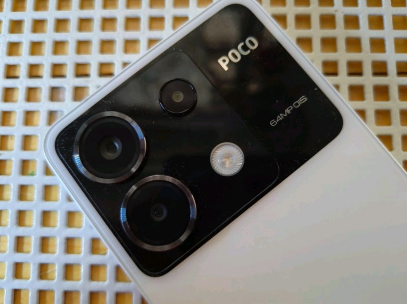 Tonjolan sensornya terlihat jelas saat diletakkan di vbidang datar. Di samping sensor terdapat branding Poco dan teks ‘64MP OIS’.
