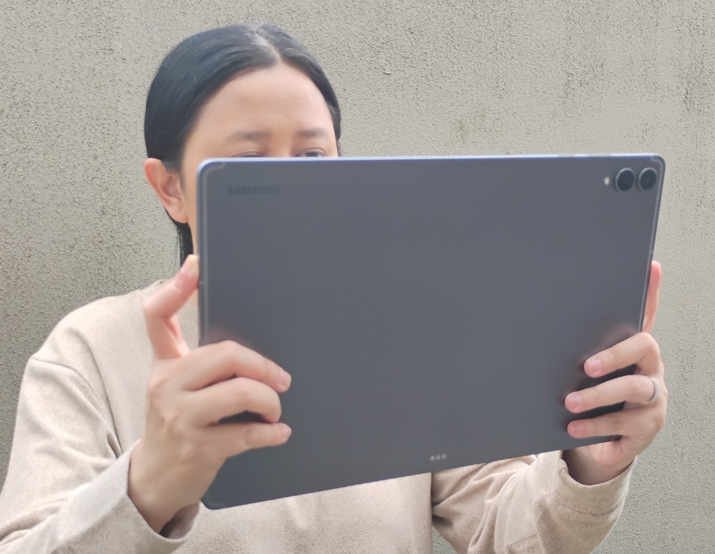 Meskipun dilengkapi dengan layar raksasa berukuran 14,6 inci, desain bingkai dan pemilihan material yang menggunakan Armor Aluminium dan kaca depan memberikan kesan bahwa tablet ini bukan hanya sekadar layar besar, tetapi juga dilengkapi dengan perlindungan dan perhitungan yang matang.