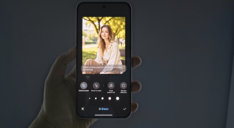 AI Eraser 2.0: untuk menghapus objek atau orang yang tak diinginkan, termasuk pantulan cahaya atau gangguan visual.